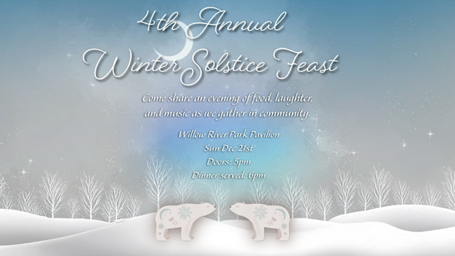 Please join us at the pavilion in Willow River Park for the Winter Solstice Feast. The evening will include potluck style dinner, live music, silent auction, and door prizes.