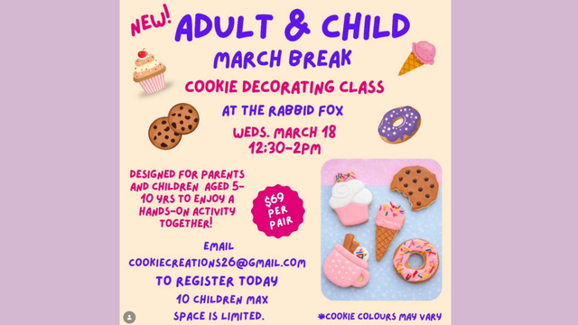 Registration includes one adult and one child (ages 5-10) with a 5-cookie decorating kit