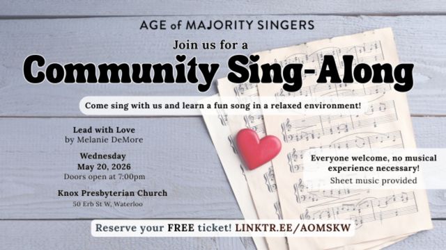 Come learn to make music with the Age of Majority Singers! Join us for an evening of learning to sing “Lead with Love” by Melanie DeMore. Led by Mary-Catherine Pazzano, singers will start with a warm-up and work on learning the song alongside AOMS members. Music will be provided and everyone is welcome, no musical experience necessary.