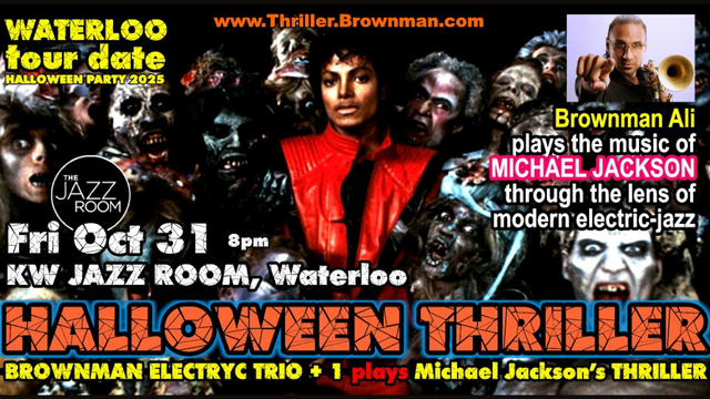 JUNO & GRAMMY nominated jazz/hip-hop trumpet playing iconoclast BROWNMAN ALI (Jay-z, Missy Elliot, Kanye West, Guru’s Jazzmatazz) will once again lead an all-star quartet through his popular annual HALLOWEEN THRILLER concert, this year travelling up from Brooklyn, NY to various venues (and schools) across Southern Ontario. The much lauded BROWNMAN ELECTRYC TRIO + 1 will perform the entire Michael Jackson “Thriller” recording, interpreted and re-worked in the Miles Davis-esque fashion this multiple National Jazz Award winning improviser has become known for. In addition to the quartet performing Thriller from top to bottom, other MJ classics will be featured through the night for this unique Halloween Series jazz party. Costumes and Thriller video dance moves encouraged!