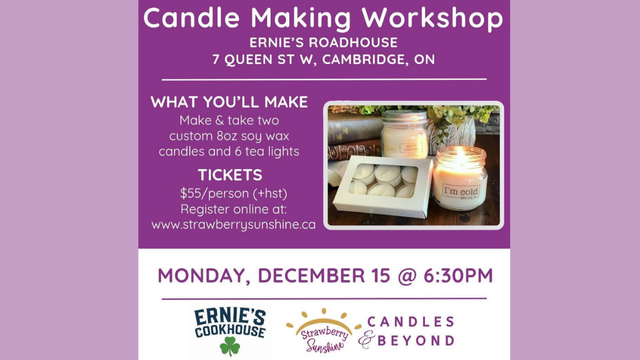Join us at Ernie’s Roadhouse on Mon, Dec 15 at 6:30pm for our final Candle Making Workshop of 2025!
