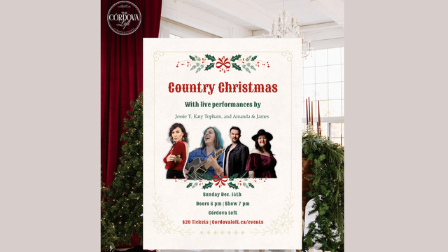 Come home for the holidays with Córdova Country Christmas. Join local Country Stars Jessie T, Katie Topham, and Amanda & James in a night of music, line dancing, and boot stomping.