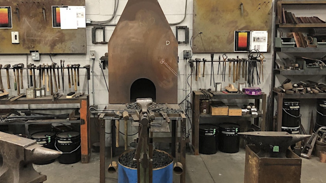 This is a two day forging intensive that focuses on solid fuel fire management, forging skills and techniques and tool making .