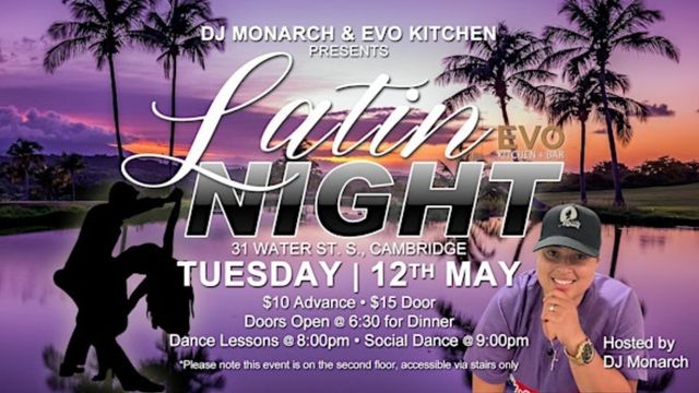 Come join us for a night filled with Latin music and great vibes at EVO Kitchen & Bar hosted by DJ Monarch! Start the night off with Salsa and Bachata lessons by KYnamics Dance & Fitness from 8-9PM. Then, get ready to dance the night away to the hottest Latin beats from 9-12AM. Whether you’re a seasoned salsa dancer or just looking to have a good time, this event is perfect for everyone. Don’t miss out on the fun – mark your calendars for Latin Night at Evo Kitchen and Bar!