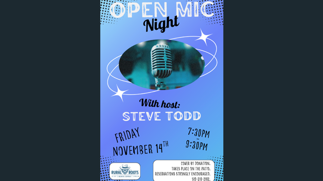 Have you been wanting to share your talent with an audience? Want to share an original song, or cover your favourite? Come out to Rural Root Brewery on Friday, November 14th at 7:30 to get on stage! HOSTED BY STEVE TODD.