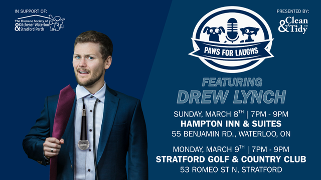 Join the Humane Society of Kitchener Waterloo & Stratford Perth for the 7th Annual Paws for Laughs comedy show and laugh your tail off for a great cause. This year’s headliner is internationally acclaimed comedian Drew Lynch, guaranteed to have you howling all night long!
