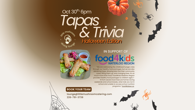 Join us for a spooktacular evening of Food & Beverage-themed Trivia at Little Mushroom Catering’s cozy lounge in Cambridge! Gather your brainiest friends and form a team of up to 4 people for a frightfully fun night of trivia, tapas, and tons of prizes. Costumes are welcome—but clever thinking is a must!