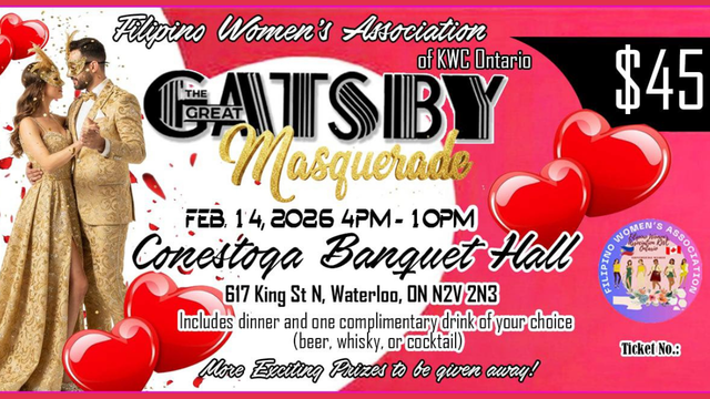 Hosted by the Filipino Women’s Association, this dazzling event takes place on February 14, 2026, from 4:00 PM to 10:00 PM at the Conestoga Banquet Hall. Dress to impress in your best Gatsby-inspired attire and don a masquerade mask as you dance the night away, connect with old friends, and make new memories.