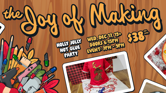 Bring your holiday spirit to this 19+ DIY fun! Our pop-up bar will be shaking up cocktails starting at 6:15 pm, so arrive early to sip something festive before you dive into the glitter. Whether you bring your own sweater or choose one of our t-shirts on hand, you’ll deck it out with screen printing, iron-on your own quotes, add some sparkling tinsel, ornaments, and more to create the ultimate statement piece.