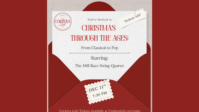 The Mill Race String Quartet presents Christmas Through the Ages. Join us for a journey beginning with a Baroque Christmas Concerto from Arcangelo Corelli, through 18th Century Carols of Faith, into the Nostalgic Christmas classics of the 1940’s, and your pop favourites from every decade since!