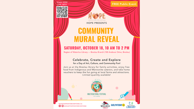 Join us October 18, 10 am–2 pm at Breslau Library to unveil a community mural celebrating identity, belonging, and connection, led by artist Jen Horst.