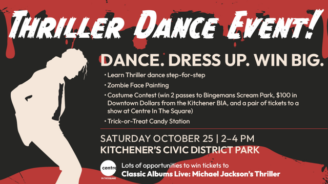Join us Saturday, October 25, 2–4 PM at Civic District Park, Kitchener, for free Thriller dance lessons, costumes, candy, face painting, and awesome prize giveaways!