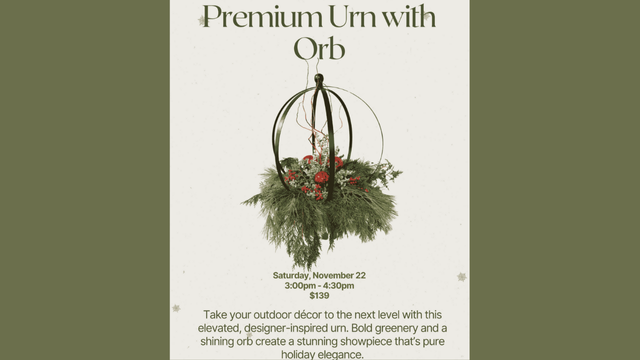 Meadow Acres 2315 Queen St, Petersburg, ON, CanadaTake your outdoor décor to the next level with this elevated, designer-inspired urn. Bold greenery and a shining orb create a stunning showpiece!