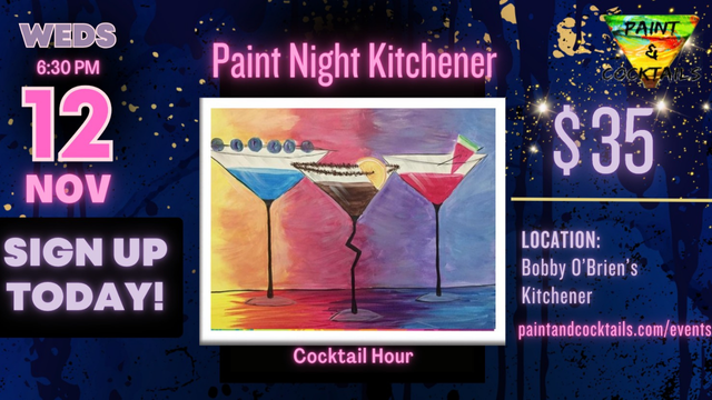 ![]() Join us Nov 12 at Bobby O’Brien’s, Kitchener for a fun paint-and-sip night! No experience needed—just bring your creativity and enjoy drink specials!